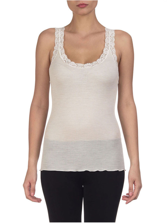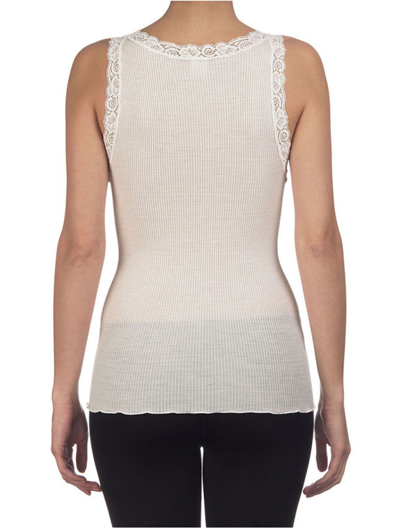 Canotta spalla larga in tessuto a costine 70% lana e 30% seta.