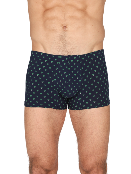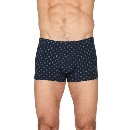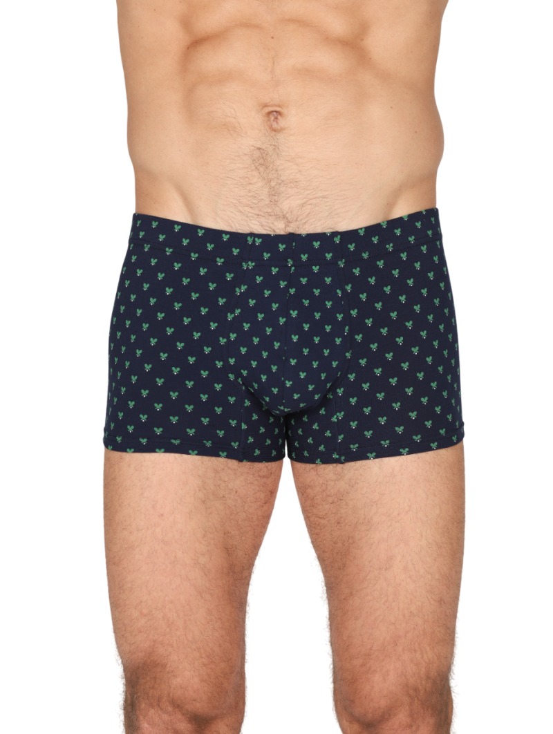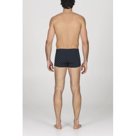 Boxer uomo in jersey di cotone bielastico blu stampato fantasia racchette. Pannello posteriore senza cuciture, elastico coperto. Massimo comfort e dinamismo. Per chi è alla ricerca di un prodotto elasticizzato di qualità, moderno e con una bassa percentuale di elastan.