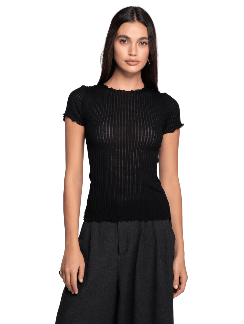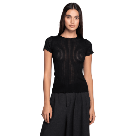 Maglia girocollo a maniche corte realizzata in un delicato tessuto a coste ajouré, misto lana Merino extrafine e pura seta di prima qualità, che avvolge il corpo e si distingue per il suo caratteristico e prezioso effetto see-through.