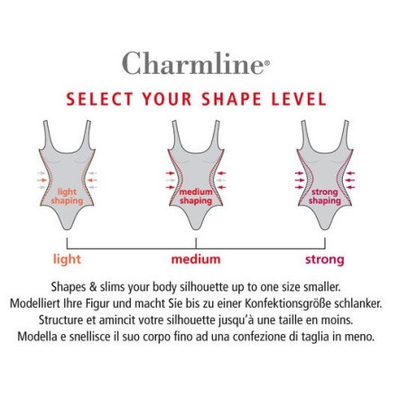 Charmline; Costume intero che grazie ai tessuti tecnici ad alto contenuto di lycra ,alle cuciture studiate , modellano la silhouette in forme armoniose. Charmline è specializzato nella produzione di costumi modellanti , propone diversi livelli di shapewear ( modellazione ) per le diverse esigenze. Tessuti leggeri per alte prestazioni a rapida asciugatura , estremamente resistenti alle acque clorate.