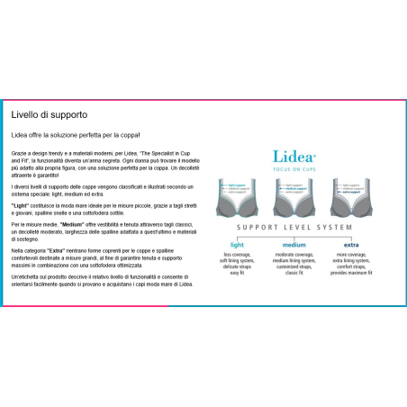 Lidea marchio made in Germany è azienda leader nei costumi interi e bikini con coppe differenziate, che garantiscono sostenibilità e comfort anche alle donne più esigenti. Lidea è sinonimo di costumi da bagno moderni e attraenti con una vestibilità perfetta. Tre livelli di supporto per diverse taglie di A-H assicurano un comfort ottimale. Lidea per la donna che non vuole rinunciare alla sua femminilità, indossando un capo unico e comodo che non farà di certo passare inosservate