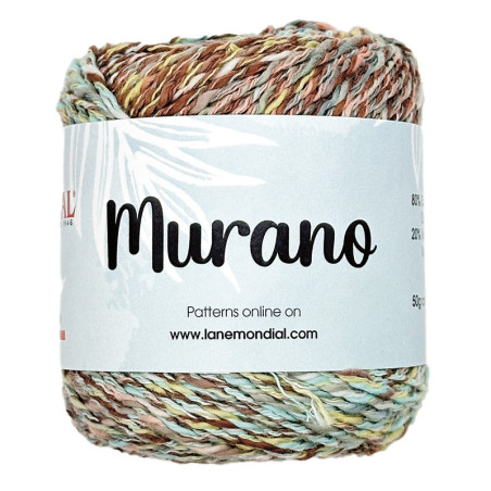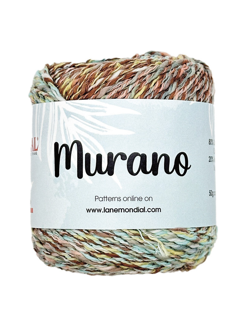 Murano filato .Il nome, di grande richiamo artistico, suggerisce le principali caratteristiche di questo nuovo filato Mondial: un filo molto colorato, dal carattere variegato! Murano mescola cotone e viscosa in un gioco di stampe molto particolare, reso ancora più mosso dalla caratteristica leggera fiammatura. Leggero e di facile lavorazione, Murano si presta alla realizzazione di canotte e cardigan anche con lavorazioni semplici che rendono davvero protagonista il filo stesso.