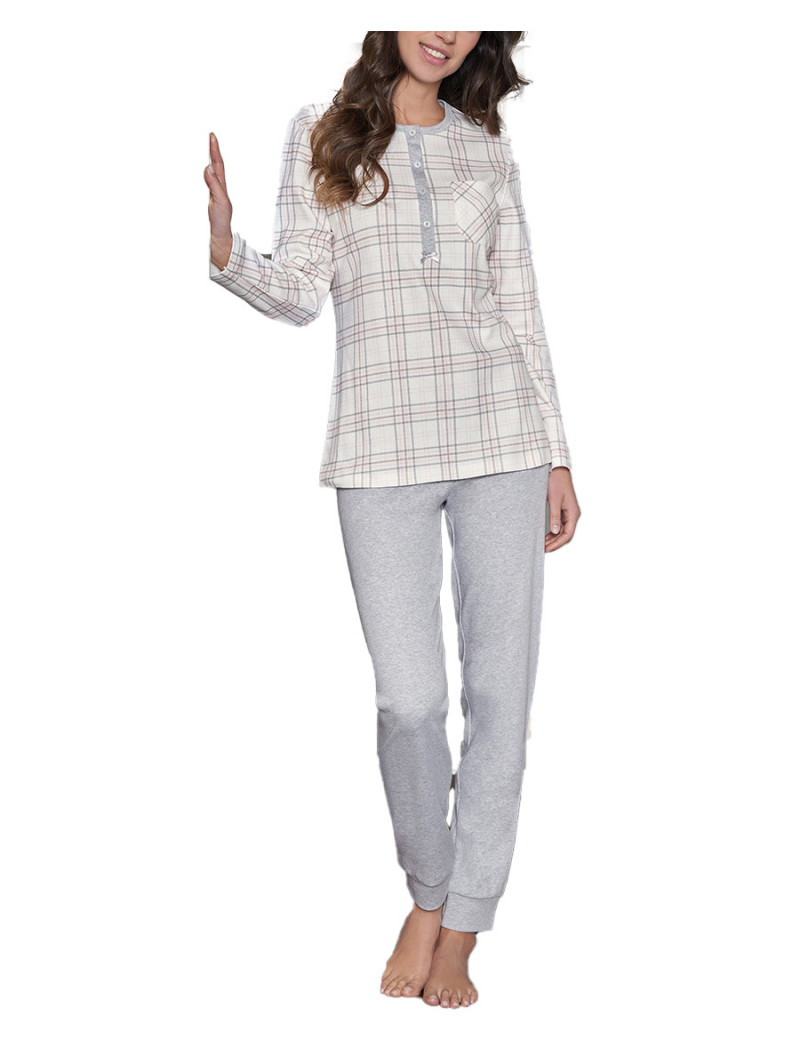 Bisbigli . Pigiama serafino in puro interlock di cotone. Maglia  a stampa geometrica con taschino. Pantaloni in tinta unita e polsini. Tessuto dalla mano calda , ideale per la stagione fredda.