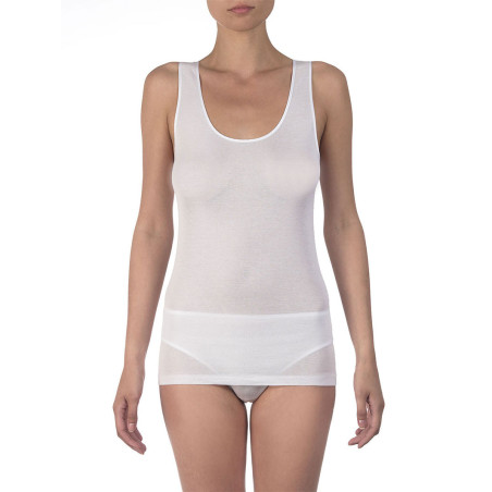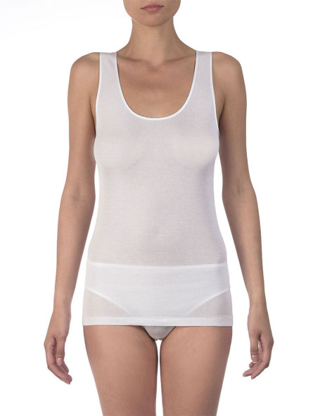 Un capo realizzato in puro cotone egiziano Makò (Filoscozia®) con il miglior tessuto a maglia piatta: linee semplici e pulite con un dettaglio femminile dato dall'elegante bordino in raso. Massima vestibilità grazie alla comoda tracolla regolabile e all'assenza di cuciture laterali.