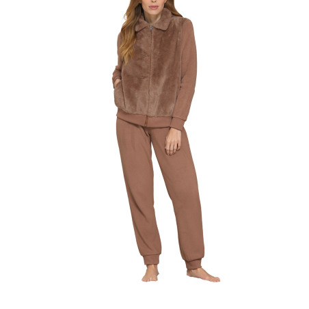 Tuta con collo . Giacca aperta con una comoda zip in caldo tessuto in pile ecofur . Con tasche . Pantaloni con polsini . Morbida , calda e confortevole . Ideale per vivere la casa in libertà