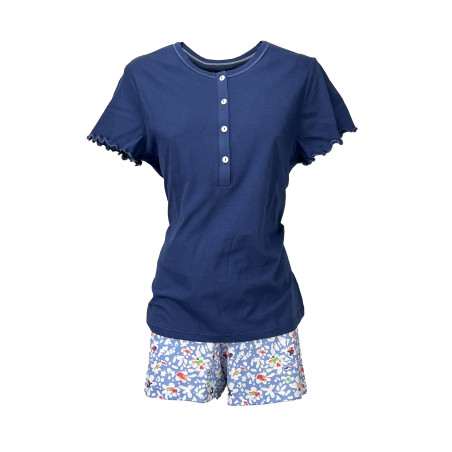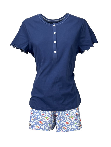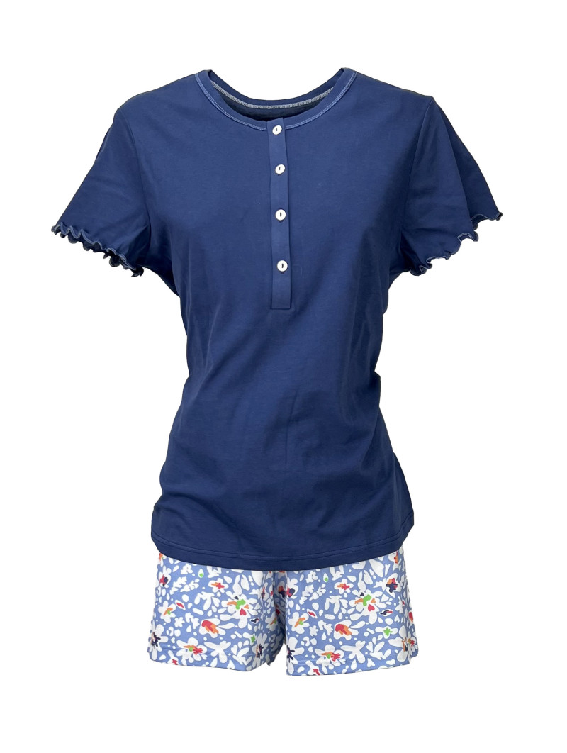 Pigiama corto con maglia collo a serafino in puro cotonr . Pantalone stampato e maglia in tinta unita . Confortevole e fresco.