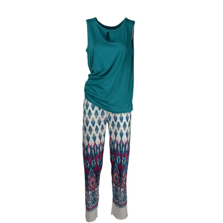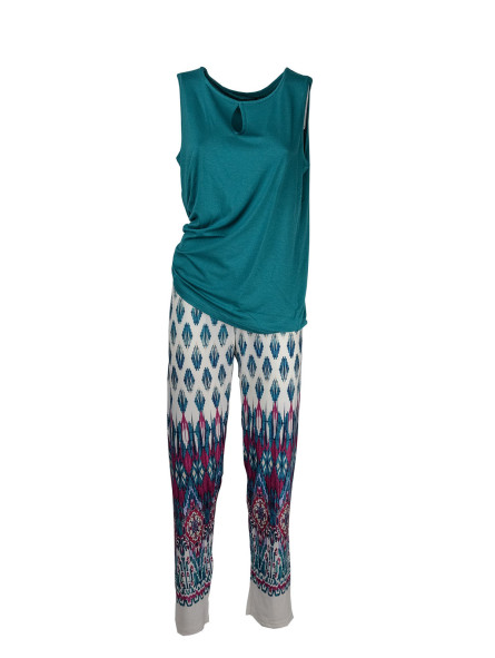 Bisbigli. Maglia in tinta unita smanicata con scollatura a goccia. Pantalone lungo stampa geometrica. Viscosa elasticizzata , leggero morbido e fresco. Ottima la vestibilità.