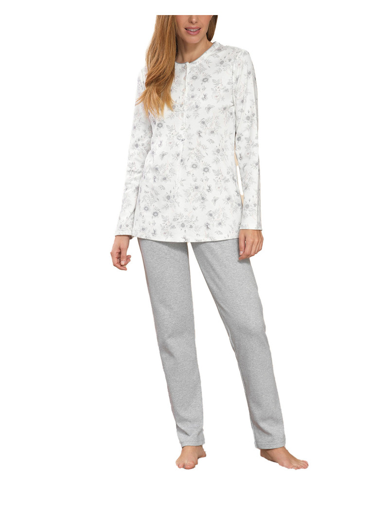 Pigiama Serafino . Maglia in fantasia e Pantaloni in Tinta Unita. Tessuto in Puro Cotone Interlock