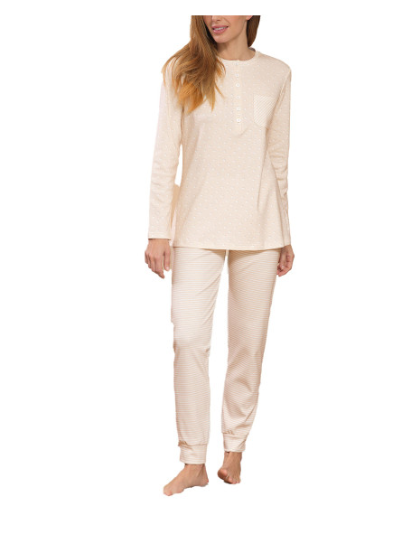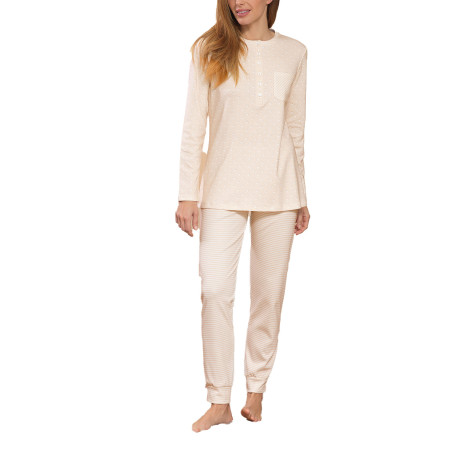 Pigiama a serafino in caldo interlock di puro cotone. Maglia in fantasia a pois con taschino . Pantalone a fantasia riga con polsini.