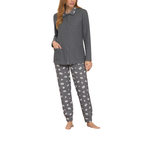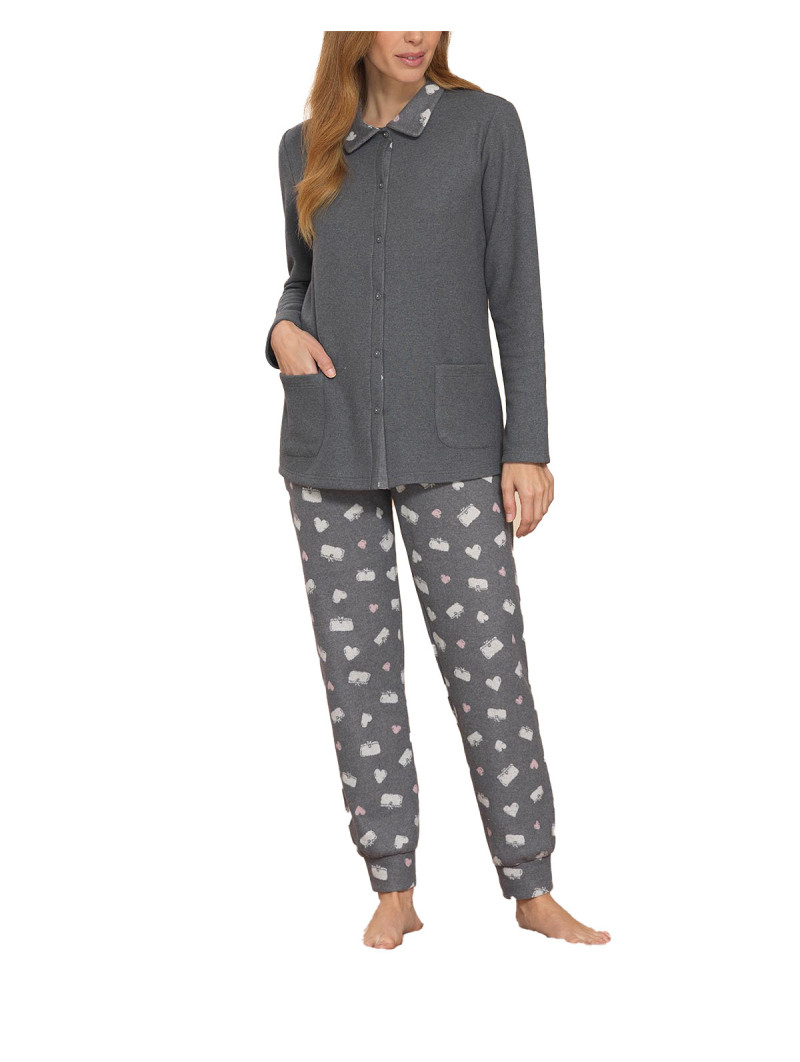 Pigiama aperto con collo in tessuto punto milano. Maglia in tinta unita con collo in fantasia a contrasto . Con maniche . Pantaloni in fantasia con polsini . Ideale per la stagione fredda.