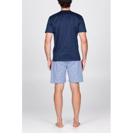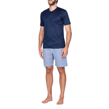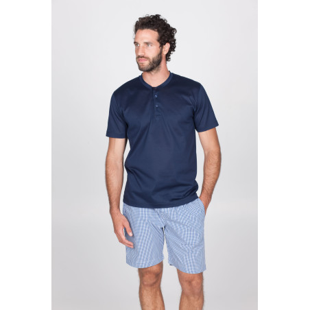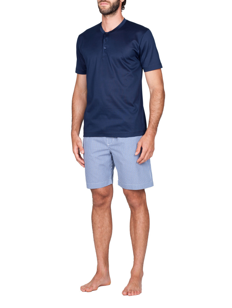 Julipet . Forlì Pigiama corto serafino mix & match: maglietta in raffinato jersey 60/2 di puro cotone mercerizzato e pantaloncino in popeline tinto in filo di puro cotone. Taglio contemporaneo per un classico da uomo. Tocco piacevole, vestibilità impeccabile, per un comfort seasonless.