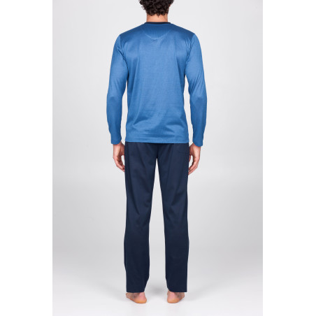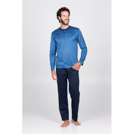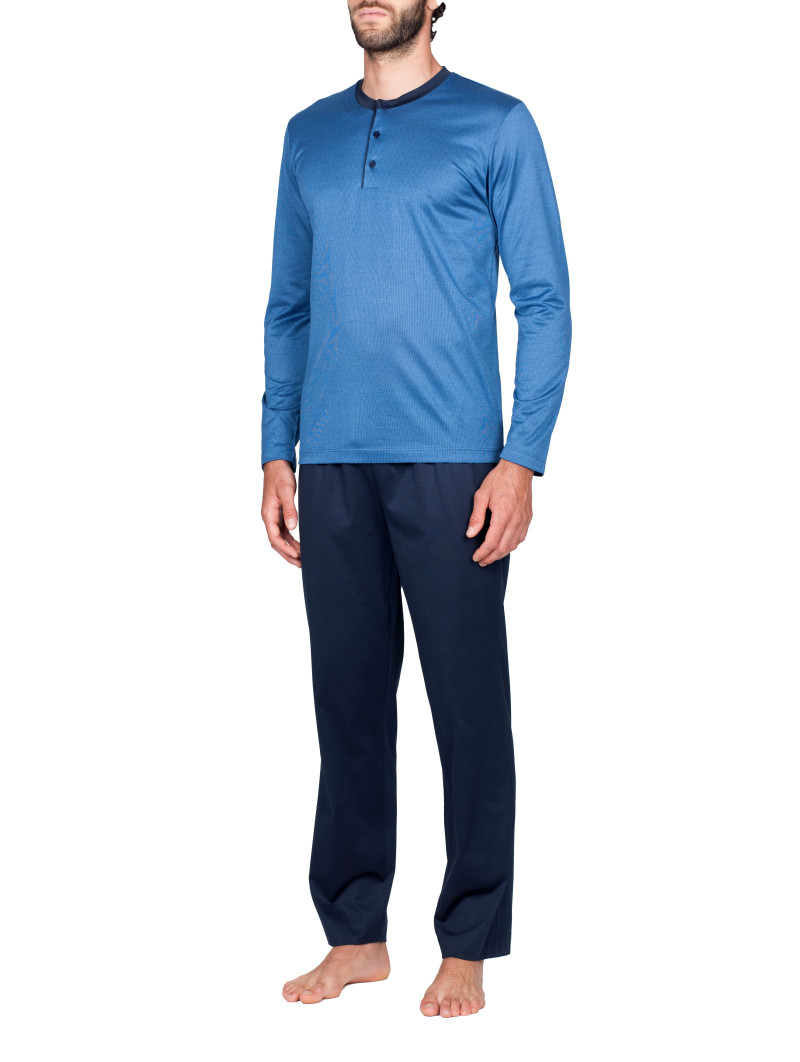 Pigiama lungo uomo, in ricercato puro cotone Filoscozia di Qualità Certificata tinto in filo. Maglia in micro-fantasia, con collo serafino e pantaloni in tinta unita. Tessuto italiano dall'aspetto setoso e raffinato. Particolarmente lucente e con una eccezionale definizione dei colori.