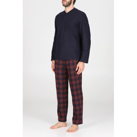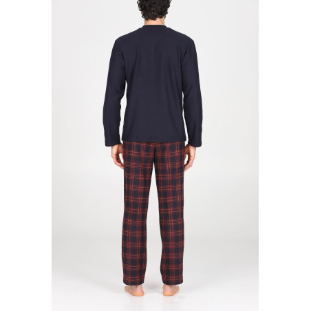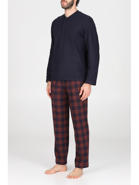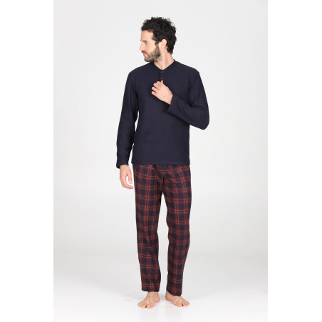 Pigiama lungo uomo in jacquard di cotone: caldo, elegante e pratico è adatto sia per la notte che al vestire in casa per un massimo comfort. Maglia a serafino in tinta unita e pantalone in fantasia classica.