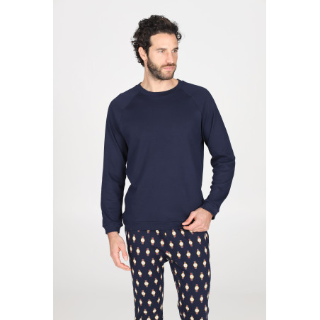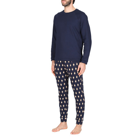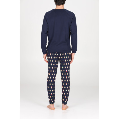 Pigiama lungo uomo, in interlock 30/1 di puro cotone. Morbido, caldo e naturale è adatto alle stagioni più fredde per un massimo comfort. Maglia girocollo in tinta unita e pantaloni in fantasia con coulisse in vita.