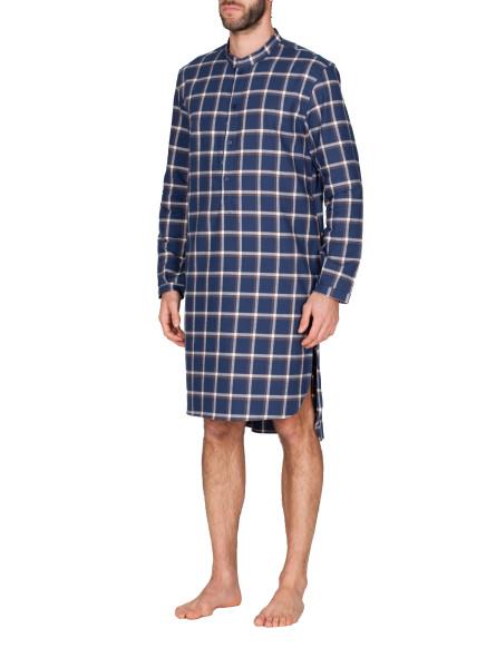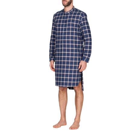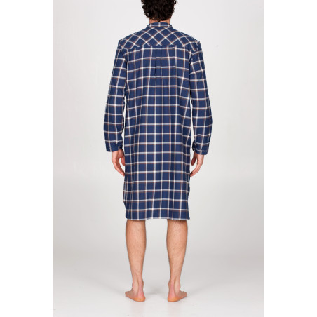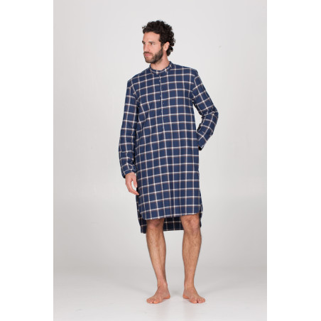 Camicia da notte uomo in calda flanella: tradizionale, naturale ed elegante . Si torna alle origini delle prime produzioni di pigiami, dove la flanella di cotone era la regina dei tessuti navetta . Modello a serafino con colletto alla coreana in fantasia a quadretti.