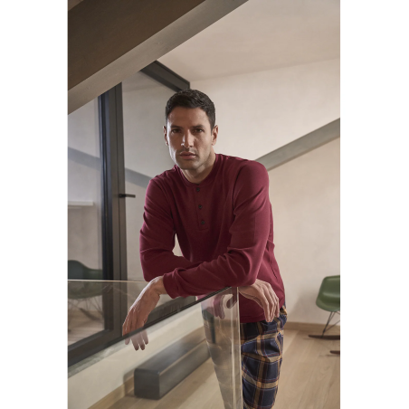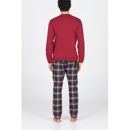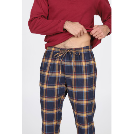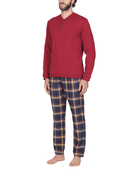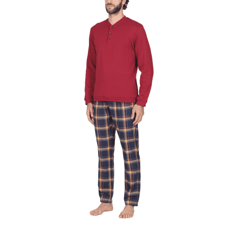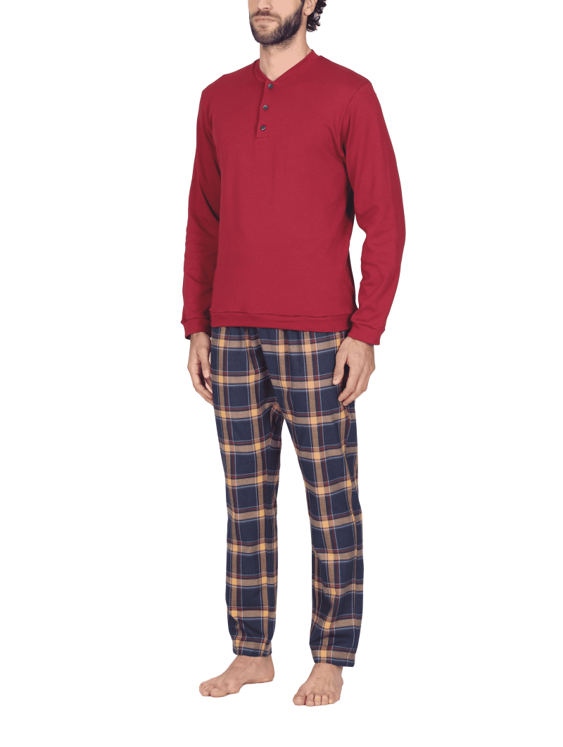Pigiama lungo uomo, maglia collo serafino in interlock 30/1 di puro cotone in tinta unita rossa. Pantaloni in calda flanella in fantasia scozzese color, senza polsini. Una proposta notte uomo dal comfort assicurato e dalla mano morbida e calda.