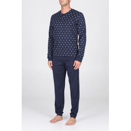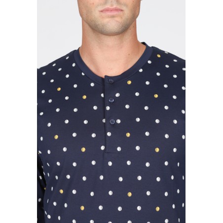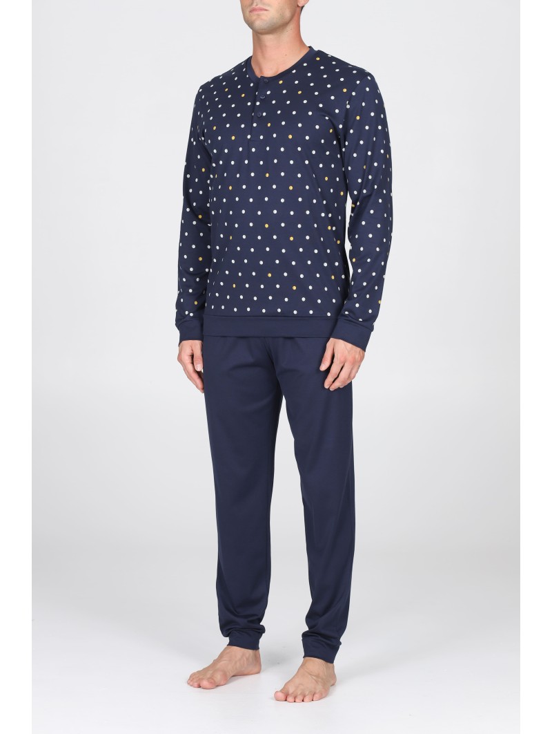 Pigiama lungo uomo, in fresco jersey 80/2 di puro cotone gasato, doppio ritorto: estremamente leggero consistente e morbido. Particolarmente adatto a soddisfare la richiesta di qualità del consumatore più esigente. Maglia con collo a serafino in fantasia "tennis", pantaloni in tinta unita blu. Con polsini.