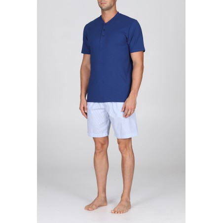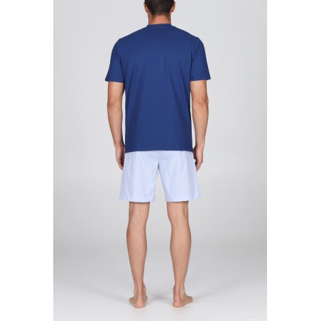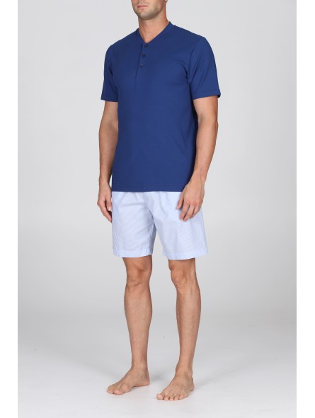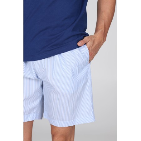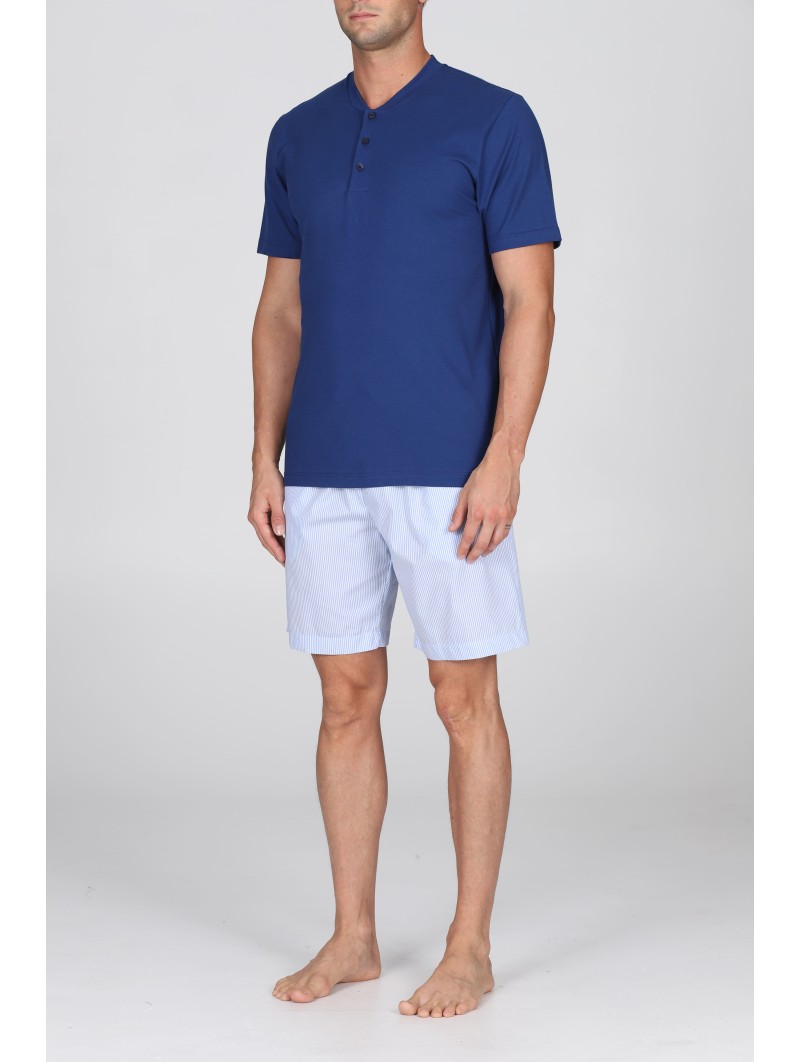 Pigiama corto serafino mix & match: maglietta in fresco jersey 36/1 di puro cotone, colore bluette. Pantaloncino in popeline tinto in filo di puro cotone, disegno riga. Taglio contemporaneo per un classico da uomo. Tocco piacevole, vestibilità impeccabile, per un comfort seasonless
