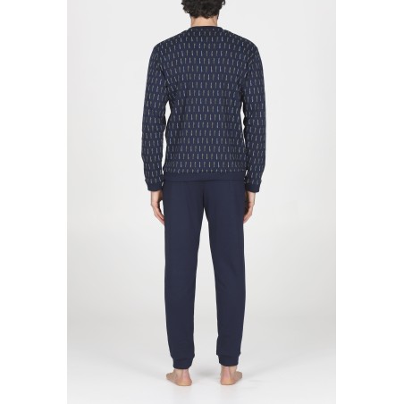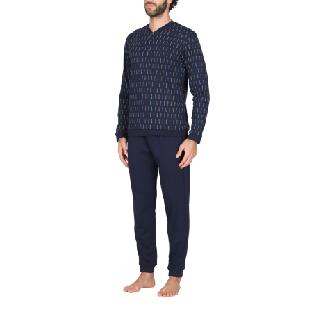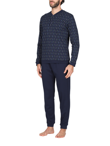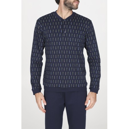 Pigiama lungo uomo, in interlock 30/1 di puro cotone. Morbido, caldo e naturale è adatto alle stagioni più fredde per un massimo comfort. Maglia a serafino in fantasia con disegno penne stilografiche e pantalone in tinta unita, con polsini elasticizzati. Equilibrio perfetto tra essenzialità e design ricercato: ideale per l’uomo che ama distinguersi anche a casa.