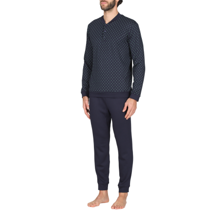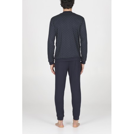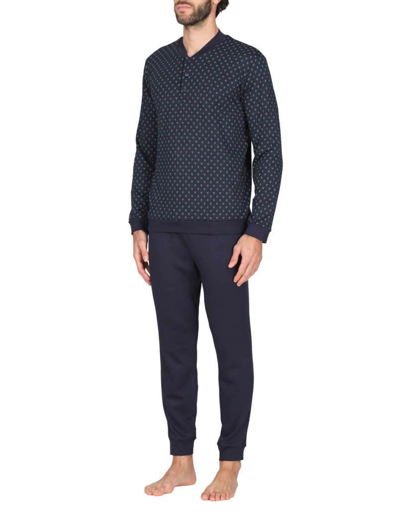 Pigiama serafino con polsini uomo, in morbidissimo interlock 30/1 di micromodal e cotone, il mix in perfetto equilibrio: cotone fresco, resistente e modal super confortevole. Maglia serafino blu con disegno a racchette. Pantalone in tinta unita blu, con polsini. Ispirazione Tennis, per un'esperienza di comfort unica, da provare.
