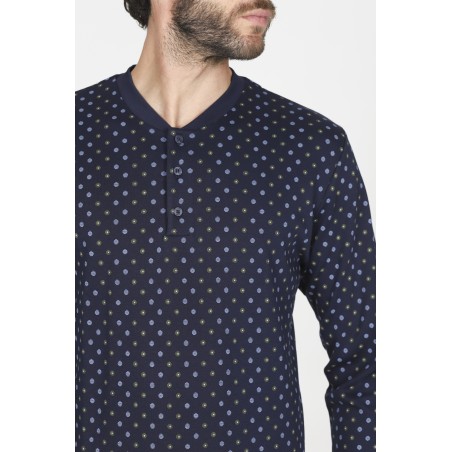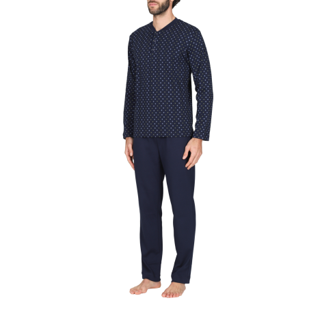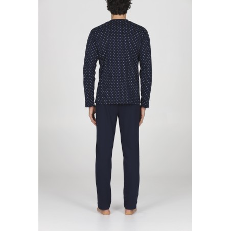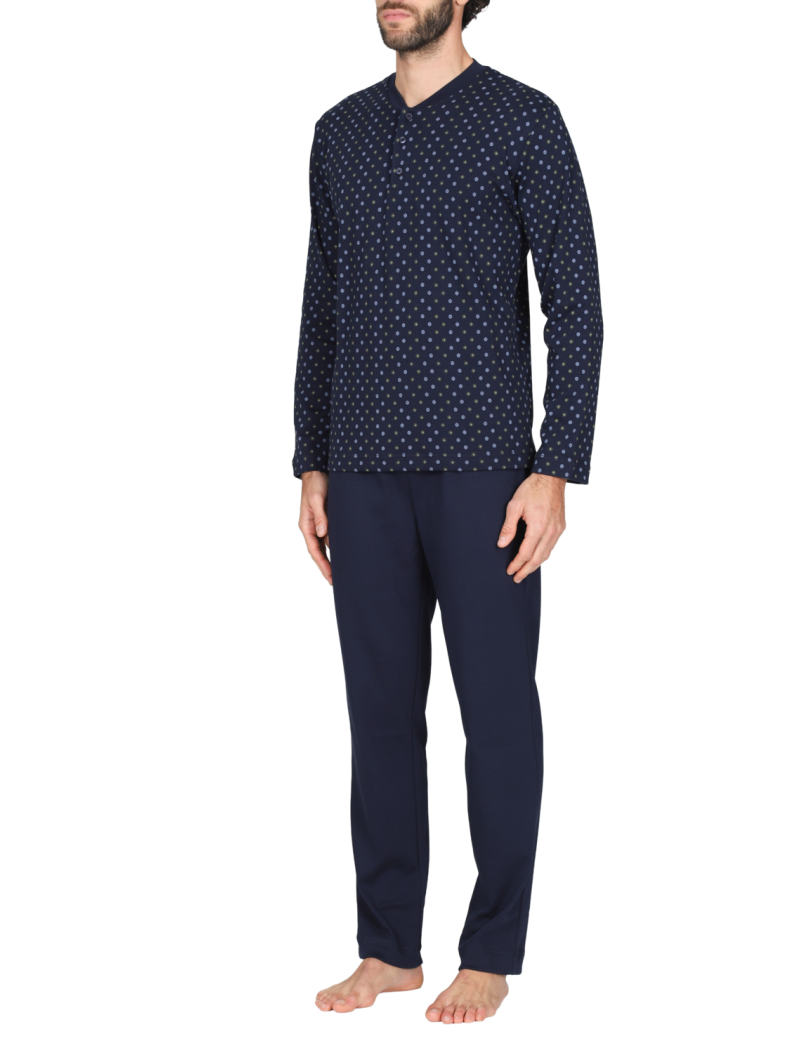 Pigiama lungo serafino uomo con polsini, in interlock 30/1 di puro cotone. Morbido, caldo e naturale è adatto alle stagioni più fredde per un massimo comfort. Maglia in fantasia "cravatta blu" e pantalone in tinta unita.