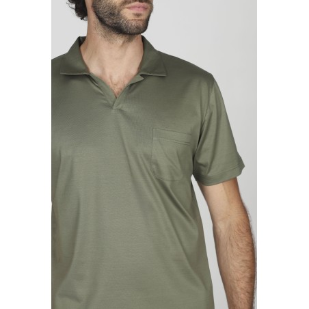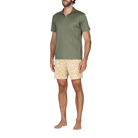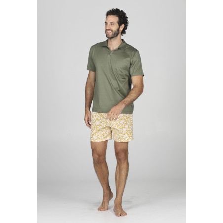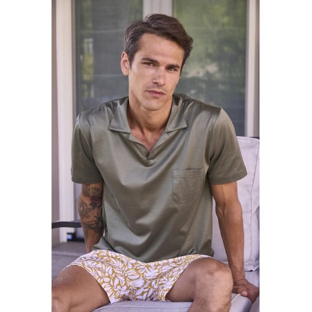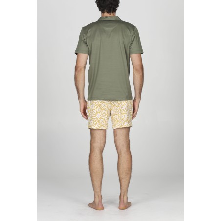 Pigiama corto in brillante jersey 60/2 di cotone doppio ritorto, mercerizzato. Maglia polo in tinta unita verde. Pantaloncino con esclusivi disegni fantasia. Mano setosa dall'aspetto ricco ed elegante. Peso leggero per un perfetto connubio tra comfort e raffinatezza