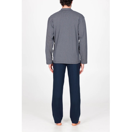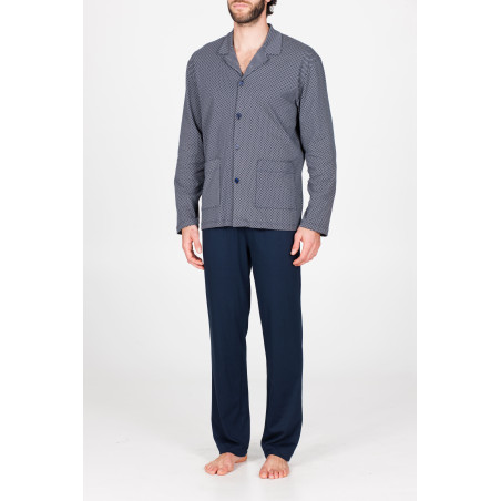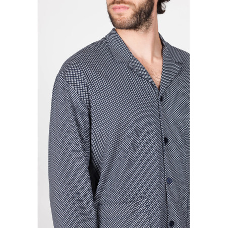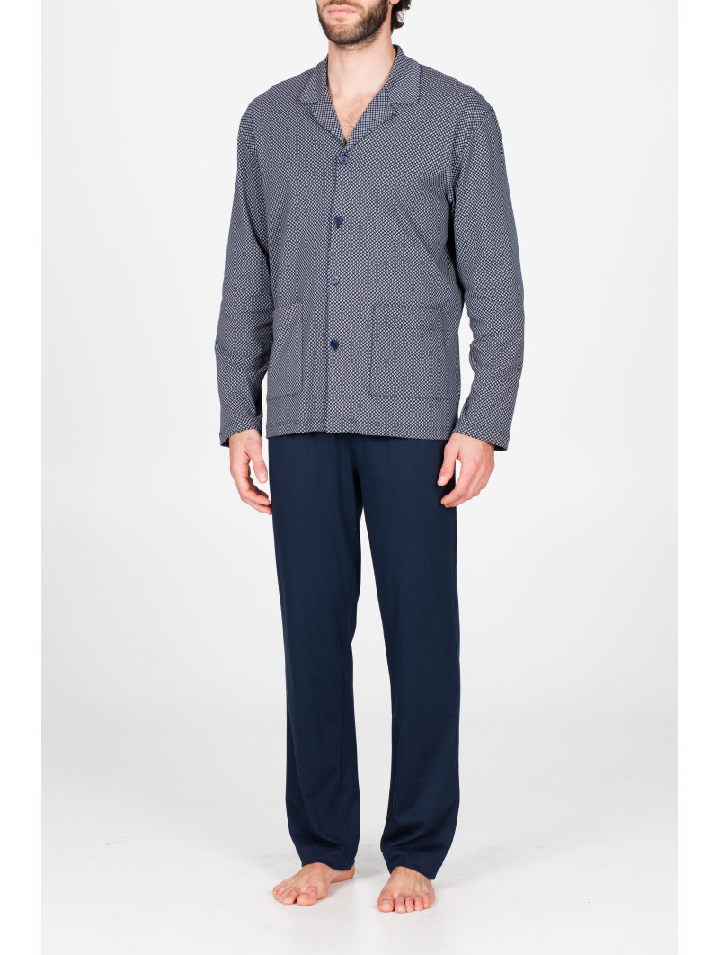 Pigiama lungo uomo, in doppio jersey 60/1 di puro cotone leggero. Morbido ed estremamente piacevole al tatto, dall’impareggiabile comfort adatto a tutte le stagioni. Maglia modello cardigan in fantasia.