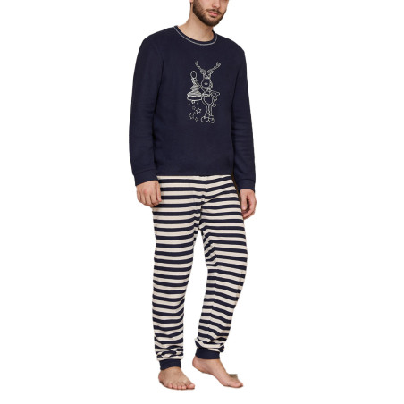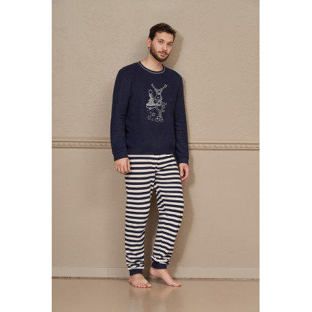 Pigiama a girocollo in punto milano jacquard. Stampa fluorescente al buio e pantaloni in fantasia riga con polsini. Punto milano un tessuto morbido e caldo ideale per vivere la casa nella stagione fredda.